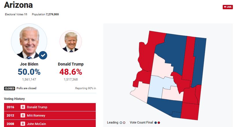 По данным Fox News, после подсчета 90% голосов демократ Джо Байден обошел Трампа в Аризоне на 0,5% (18 713) голосов.