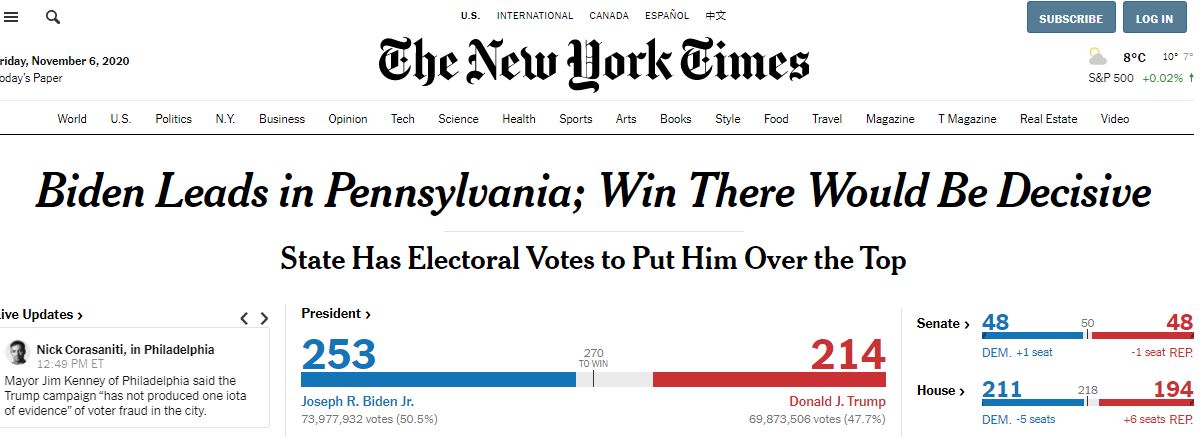 22:09 в Твиттере американской газеты The New York Times уже сообщили, что первая полоса завтрашнего номера будет посвящена победе Байдена над Трампом на президентских выборах.