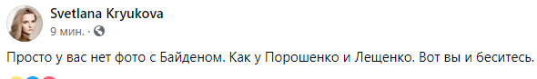 22:11 "Просто у вас нет фото с Байденом. Как у Порошенко и Лещенко. Вот вы и беситесь", - комментирует фото-истерию вокруг Байдена заместитель главного редактора "Страны" Светлана Крюкова.
