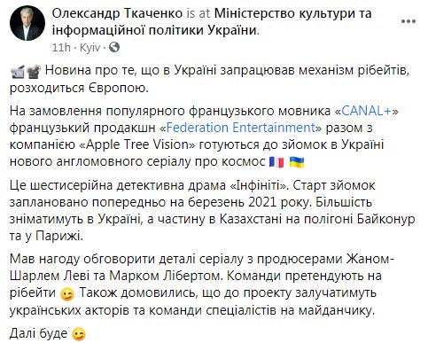 "По заказу популярного французского вещателя Canal+ французский продакшн Federation Entertainment вместе с компанией Apple Tree Vision готовятся к съемкам в Украине нового англоязычного сериала о космосе", - написал Ткаченко.