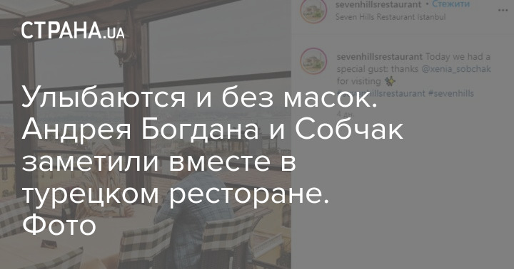 На фото Андрей Богдан мило общается с Собчак на веранде ресторана с панорамными окнами и видом на море. Собчак при этом улыбается в камеру с завязанным на голове платком, оба сидят за столом без масок.