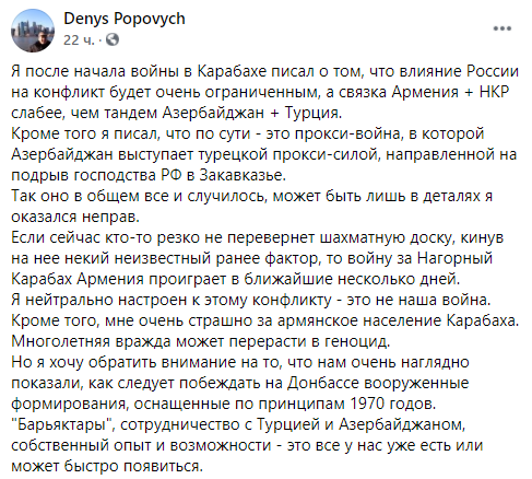 "Смотрю новости о войне в Нагорном Карабахе и думаю… угадали, о Донбассе думаю. Что-то наши соотечественники много беспокоятся об абсолютно надуманной проблеме – "ой, а стоит ли вообще возвращать тот Донбасс, а там же так много "ваты", которая ненавидит все украинское, что мы будем с ними делать, а они же сначала проведут выборы, потом проведут своих людей в Верховную Раду. Ой, там же за эти годы столько выросло детей, которые уже ненавидят Украину.