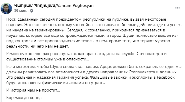 Однако уже после обеда в понедельник 9 ноября глава Нагорного Карабаха Ваграм Погосян признал, что город захвачен азербайджанцами. "К сожалению, цепочка неудач пока нас преследует, и город Шуша полностью вне нашего контроля", - написал он в Facebook.