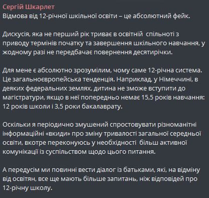"Этот вопрос был и остается открытым для профессиональной дискуссии. Мы должны наработать необходимые решения, чтобы 12-летнее школьное образование действовало, стало удобным и эффективным для детей, педагогов, родителей", - написал Сергей Шкарлет.