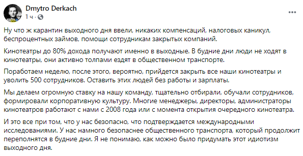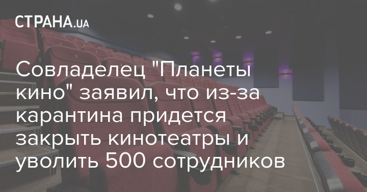 Совладелец "Планеты кино" Дмитрий Деркач заявил, что после введения карантина "выходного дня" придется закрыть кинотеатры и уволить сотрудников.