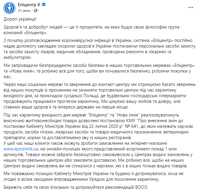 После этих обсуждений сеть "Эпицентр" выпустила заявление, из которого следует, что работать магазин будет. С оговорками, что продавать он будет только те товары, которые разрешены Кабмином. А остальные можно будет заказывать на сайте и забирать в магазине или по доставке.