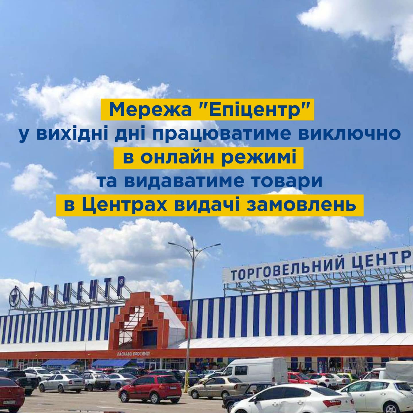 "Сеть "Эпицентр" на выходных будет работать исключительно в онлайн-режиме и выдавать товары в центрах выдачи заказов", - говорится в посте.