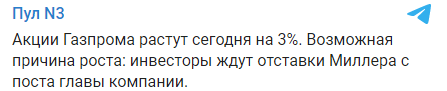 Так, говорится, что возможной причиной роста является ожидание инвесторами отставки Алексея Миллера с поста главы компании.