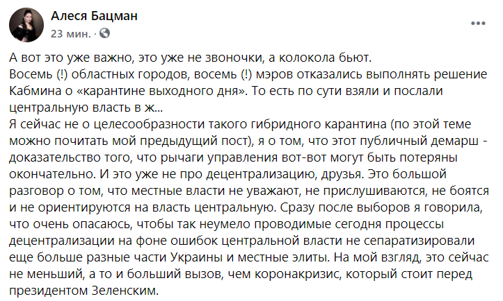Я сейчас не о целесообразности такого гибридного карантина (по этой теме можно почитать мой предыдущий пост), я о том, что этот публичный демарш - доказательство того, что рычаги управления вот-вот могут быть потеряны окончательно. И это уже не про децентрализацию, друзья. Это большой разговор о том, что местные власти не уважают, не прислушиваются, не боятся и не ориентируются на власть центральную. Сразу после выборов я говорила, что очень опасаюсь, чтобы так неумело проводимые сегодня процессы децентрализации на фоне ошибок центральной власти не сепаратизировали еще больше разные части Украины и местные элиты. На мой взгляд, это сейчас не меньший, а то и больший вызов, чем коронакризис, который стоит перед президентом Зеленским", - пишет журналистка Алеся Бацман.