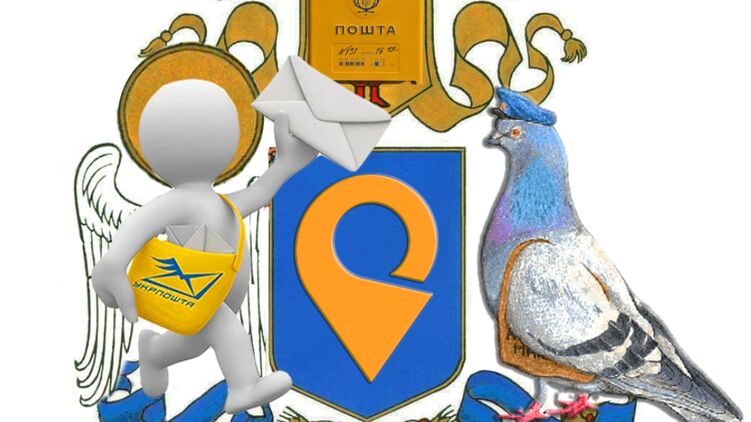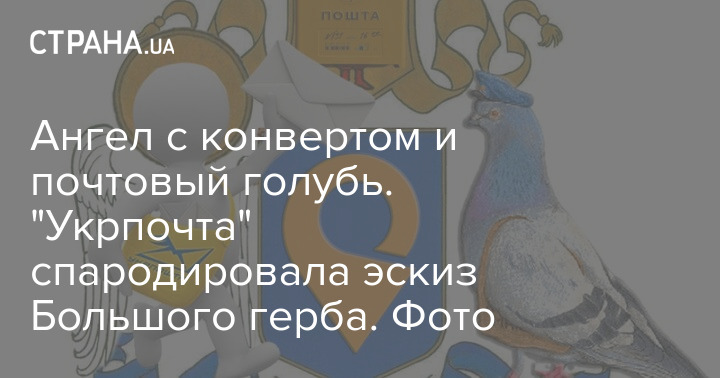 На фото изображен коллаж по эскизу большого герба Украины, в центр помещена эмблема компании и почтовый ящик. Стилистическое изображение ангела - почтальона расположено слева, а справ на него смотрит почтовый же голубь.
