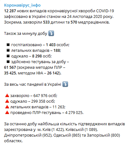 Данные на 24 ноября. Число зараженных коронавирусом в Украине выросло на 12 287 человек