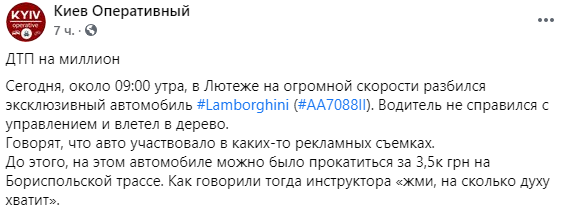 "Сегодня, около 09:00 утра, в Лютеже на разбился эксклюзивный автомобиль Lamborghini. Водитель не справился с управлением и влетел в дерево", - говорится в посте.