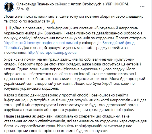 Министр Ткаченко презентовал виртуальный некрополь с могилами похороненных за рубежом украинцев