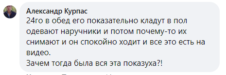 "24-го в обед его показательно кладут в пол одевают наручники и потом почему-то их снимают и он спокойно ходит и все это есть на видео. Зачем тогда была вся эта показуха?", - удивляется он.