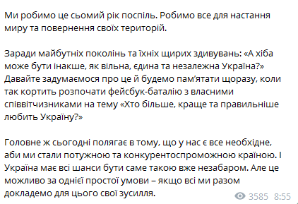 "Более 28 миллионов голосов стали одним, мощным голосом украинского народа, чтобы сказать на весь мир: "Мы хотим и будем жить в своем государстве - в свободной Украине". Впоследствии мы поймем, что обретение независимости не означает окончательного завершения борьбы. Что ее нужно защищать с оружием в руках, ценой собственной жизни. Мы делаем это седьмой год подряд. Делаем все для наступления мира и возвращения своих территорий.