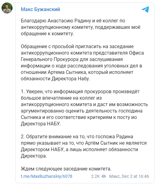 "Обратите внимание на то, что госпожа Радина прямо указывает на то, что Артем Сытник не является Директором НАБУ, а лишь исполняет обязанности Директора. Ждем следующее заседание комитета", - резюмировал Бужанский.