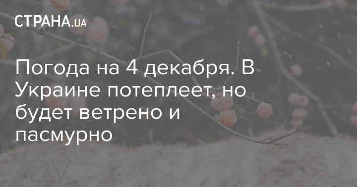 В пятницу, 4 декабря, в Украине ожидается переменно облачная погода без осадков. В западных, северных областях и в Приазовском регионе ожидаются местами порывы юго-восточного ветра 15-20 м/с. При этом на всей территории страны, кроме востока, ожидается повышение температуры на 2-5 градусов.
