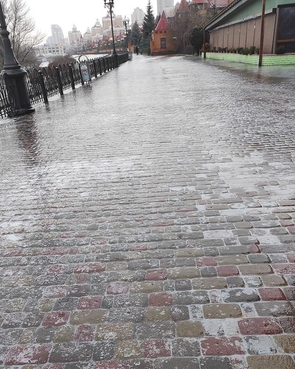 "Тротуары - стекло, люди по проезжей части идут. Иногда падают, почти под колеса. Коммунальщики тоже люди, по ночам не работают. И мэр тоже спит. Хотя, впрочем, разве в Городе есть мэр?", - пишет журналист Елена Деревянко и публикует фото заледеневшей столицы.
