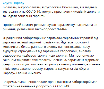 "Работники лабораторий не получили социальных гарантий от государства, как другие медицинские работники. Речь идет о стаже и возможности более раннего выхода на пенсию, дополнительном отпуске, страховании от заражения болезнями, выплате оздоровительных надбавок и доплатах к зарплатам. Мы предлагаем законом закрепить такие гарантии. Уверена, парламент поддержит это предложение и поставит точку в этом вопросе", - приводит слова инициатора законопроекта, народного депутат от "Слуги народа" Галины Янченко Telegram-канал "Слуга народа" в понедельник, 14 декабря. Отметим, что в тот день профильный комитет Рады рекомендовал парламенту поддержать соответствующий законопроект.