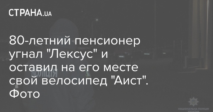 "Полиция Черниговщины задержала 80-летнего угонщика элитного авто. Меньше чем за час сотрудники Козелецкого отделения полиции с помощью неравнодушных граждан догнали и заблокировали автомобиль "Лексус", которым завладел мужчина 1940 года рождения. Вместо элитного автомобиля под сельсоветом он оставил свой складной велосипед "Аист", - указано в сообщении.