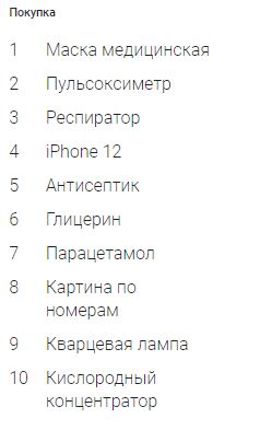 Что касается покупок, то 8 из 10 самых популярных товаров были связаны с коронавирусом, его лечением и профилактикой: маски медицинские, пульсоксиметры, респираторы, антисептики, глицерин, парацетамол, кварцевые лампы, кислородные концентраторы.