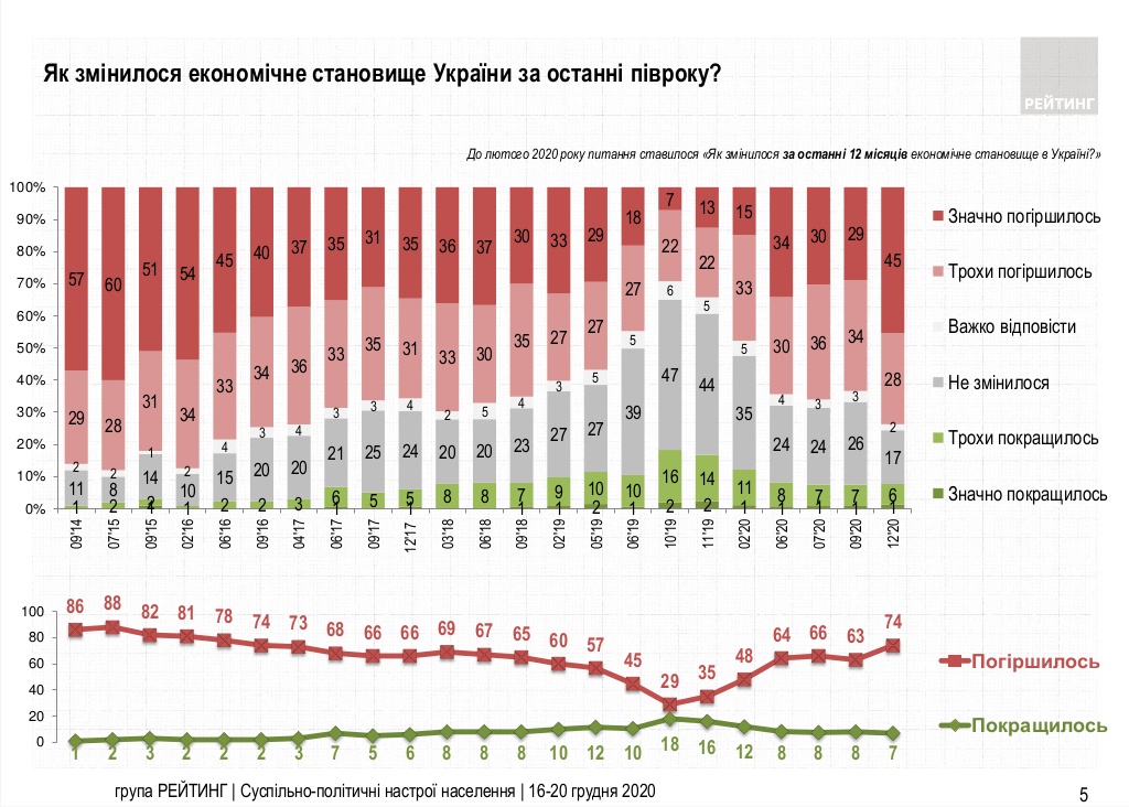 Причем списать ситуацию на коронавирус у властей уже не получается. Среди причин экономического кризиса более 60% украинцев называют некомпетентность власти, а не пандемию. И доля таких людей с лета выросла на десять процентов.