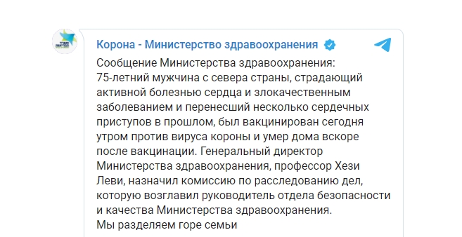 75-летний гражданин Израиля скончался от сердечного приступа спустя пару часов после вакцинации от Covid-19.