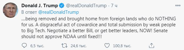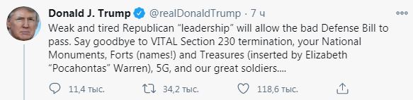 "Слабое и усталое республиканское "руководство" (в Сенате США - Ред.) позволит пройти плохому законопроекту с оборонным бюджетом", - написал Трамп в серии сообщений.