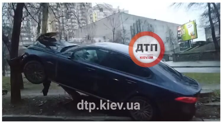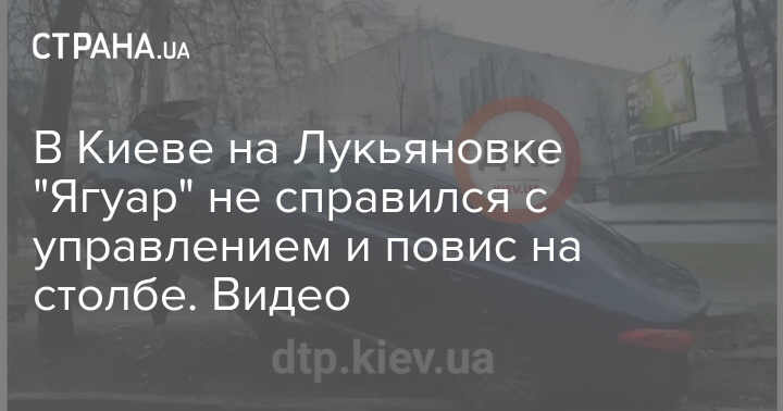 В Киеве на Лукьяновке "Ягуар" не справился с управлением и повис на столбе. Видео