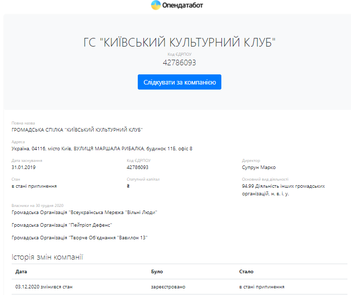 Как видно по скриншотам из реестров, решение о закрытии "Захиста патріотів" было принято 10 декабря 2020 года.
