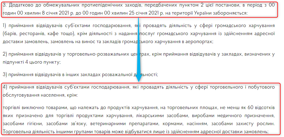 В постановлении Кабмина №1236 о карантине говорится, что с 8 по 24 января торговать разрешат только тем магазинам и супермаркетам, где не менее 60% пощади занимают такие товары: