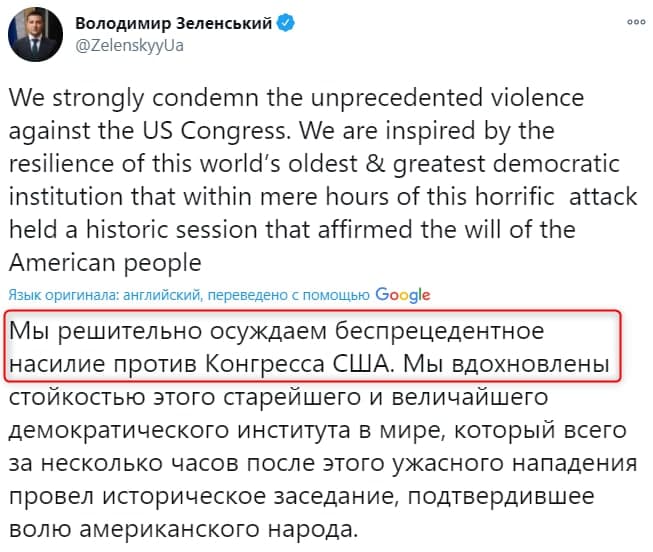 Тон этого твита сомнений не оставлял – Зеленский поддержал жестокий разгон протестов, на которых погибли четверо активистов. При этом, напомним, сами трамписты внутри Конгресса никого не избивали и вооружены не были.