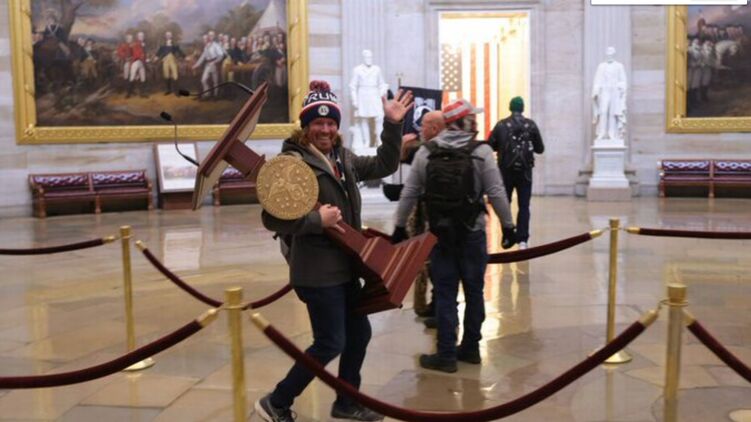 В США власти заявили об аресте жителя Флориды, одного из участников беспорядков в Вашингтоне, который был замечен на вирусной фотографии, несущим кафедру председателя палаты представителей Нэнси Пелоси через залы.