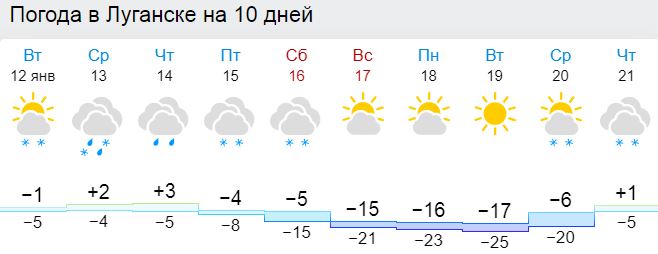 В Луганске на Крещение будет морозная и солнечная погода. Днем -17, ночью -25. Оттепель начнется с 21 января. Днем будет +1, ночью -5.