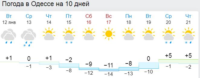 В Одессе с 16 по 18 января днем -8...-11, ночью -12...-14. Во вторник, 19 января, днем 0, ночью -10.