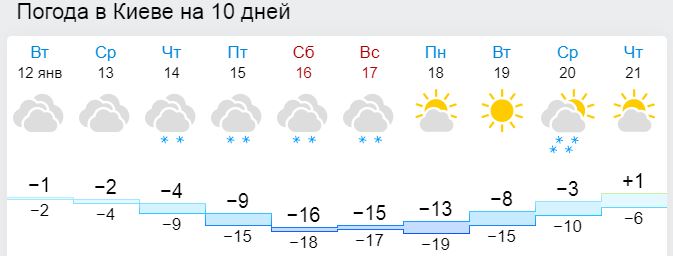 В Киеве с 16 по 18 января обещают -13...-16 днем и -17...-19 ночью. На Крещение будет ясная погода. Днем до -8 и -15 ночью.