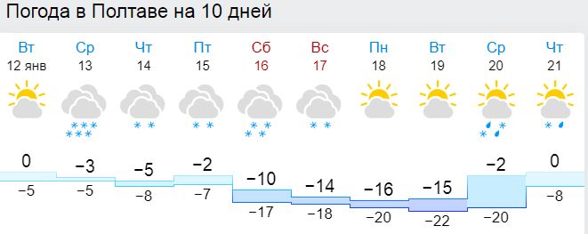 В Полтаве 19 января днем -15, ночью -22. Далее начнется оттепель и уже 20 и 21 января ожидают мокрый снег днем.