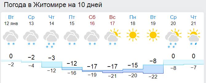 В Житомире установится похожая погода 19 января. Солнце, -8 днем и -22 ночью.