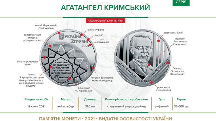 В частности, данная монета посвящена украинскому историку, слависту, языковеду, востоковеду, писателю, переводчику, одному из основателей Украинской Академии наук и одному из первых академиков - Агафангелу Ефимовичу Крымскому.