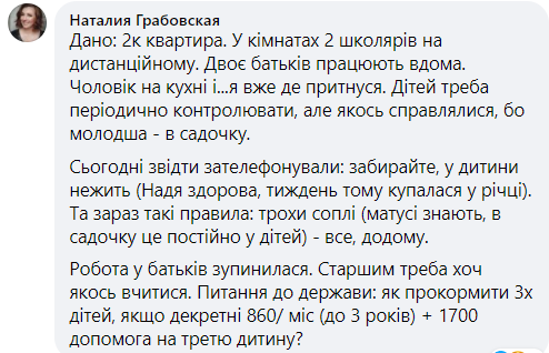 Каждому нужно организовать тихое место для учебы, т.к. дети сидят с включенными микрофонами (отвечать необходимо на вопросы учителей в онлайне), каждому нужен ноут с нормальным интернетом, чтоб не вырубало во время онлайна. Видимо, у тех, кто разрабатывал программу "дистанційного навчання", по одному ребенку, не более", – пишет Юлия Туржанская в группе "Батьки SOS" в "Фейсбуке".