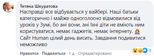 "Все скинули на родителей! Скидывают задания по Вайберу! Онлайн платформы не работают!" – пишет из Херсона Ирина Остащенко.