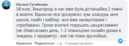 "5 класс, Вышгород: у нас уже была дистанционка 2 недели в октябре. Относительно все понятно: зум, класрум, моя школа, скайп и вайбер – все уже настроено и опробовано. Немного учителя нарушают санитарный регламент (не 20 минут каждый день, а 1-2 полноценные онлайн-урока в неделю по предмету), но так пока удобнее", – пишет Оксана Гусейнова.