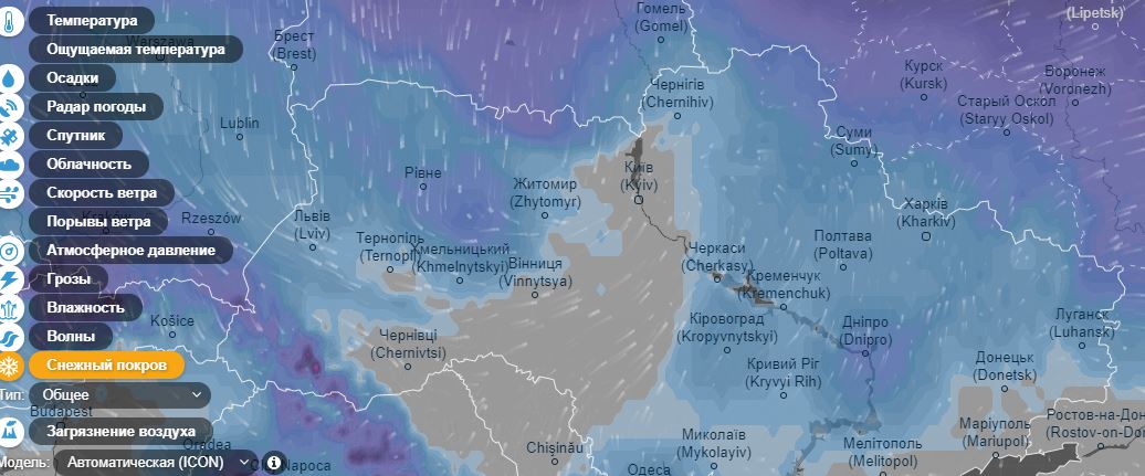 Что касается глубины снежного покрова, то самые большие сугробы в Карпатах, Житомирской, Ровенской, Луганской областях, в Днепре и Запорожье (темно-синий и фиолетовый цвет), а вот в Киеве снежный покров небольшой (серый цвет).