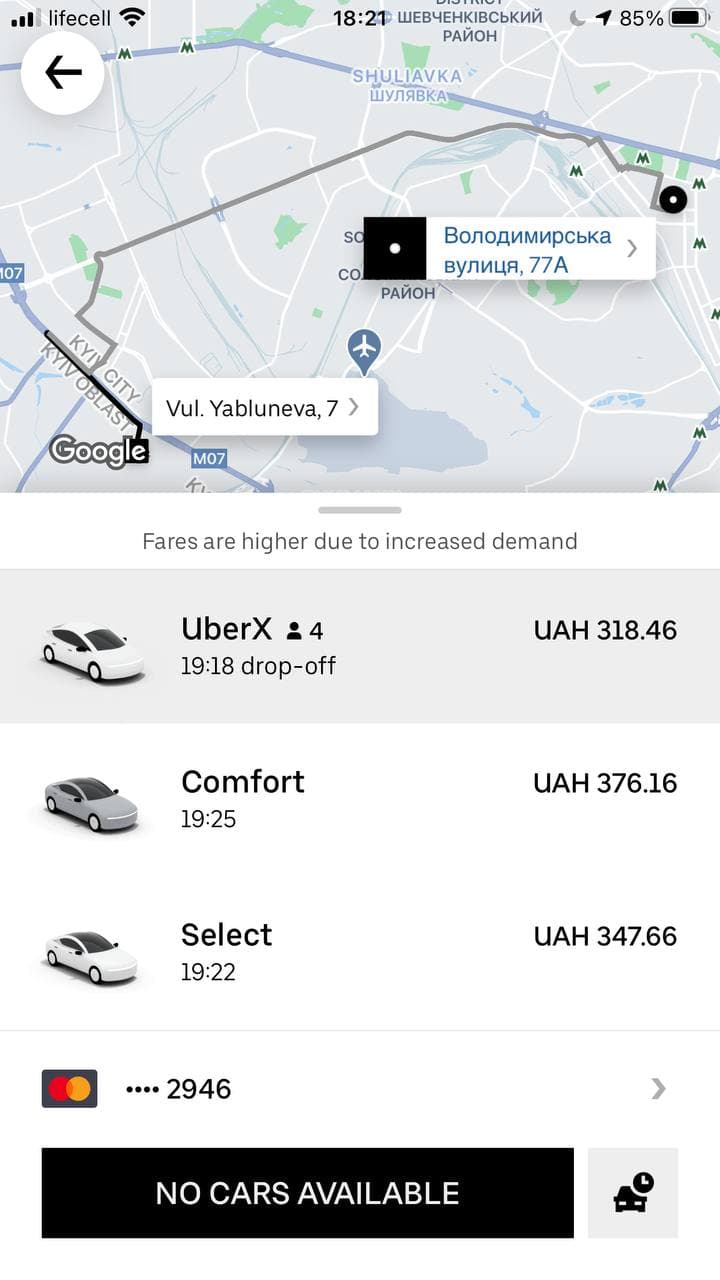 В четверг вечером за маршрут от Владимирской до Яблоневой, который обычно стоит 150 грн, таксисты просят от 318 до 376 гривен.