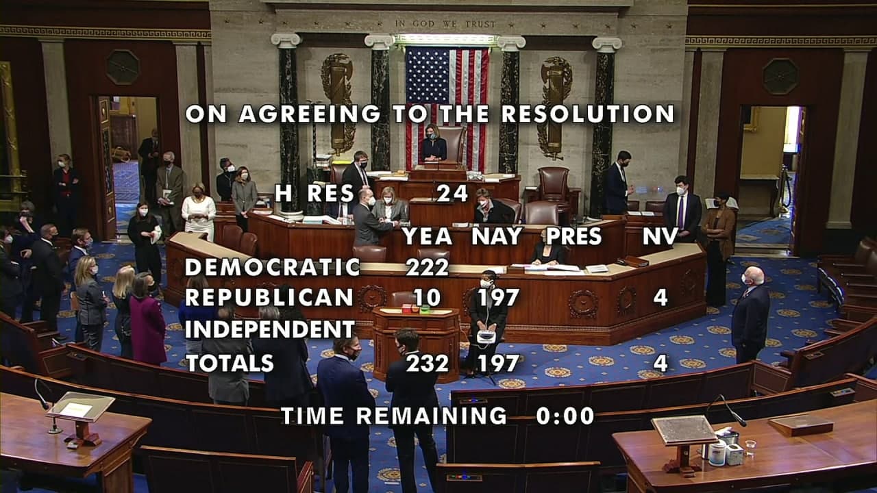 Если да, то один или несколько пунктов обвинений выносятся на рассмотрение всей Палаты представителей. Поддержать должно большинство. Для сравнения, в ходе первой попытки объявить Трампу импичмент, в декабре 2019 года, в нижней палате проголосовали 228 конгрессменов (все демократы и один независимый), против - 193 (один демократ и все республиканцы).