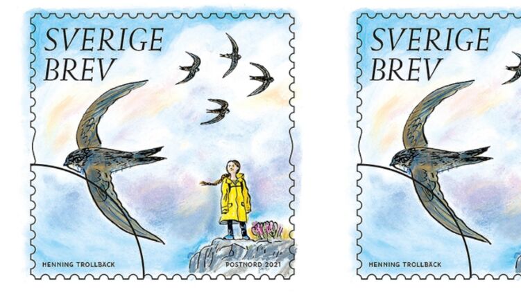 Шведско-датская почтовая компания PostNord выпустила новую почтовую марку, на ней изображена знаменитая шведская эко-активистка Грета Тунберг. Она изображена в желтом плаще, стоящей на утесе, а вокруг девушки летают птицы.