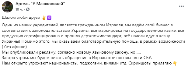 "Я публиковала рекламу со старого китайского телефона. Там нет украинской раскладки. Поэтому дала текст без украинских букв, с русской клавиатуры. Это не издевательство над языком, а просто техническая проблема. После этого посыпались угрозы. Пишут, что подожгут помещение и сломают челюсть. Решила подавать заявление в СБУ об угрозах. Мой муж, гражданин Израиля, просто в шоке от содержания угроз – очень много прислали нацистских фото времен Второй мировой войны. Очень много угроз антисемитского толка", - рассказала "Стране" владелица заведения Ирина Машкович.