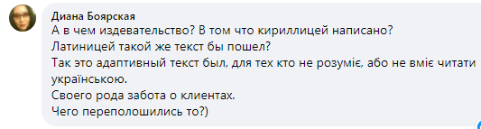 "А в чем издевательство? В том, что кириллицей написано? Латиницей такой же текст бы пошел?", - замечает одесситка Диана Боярская.