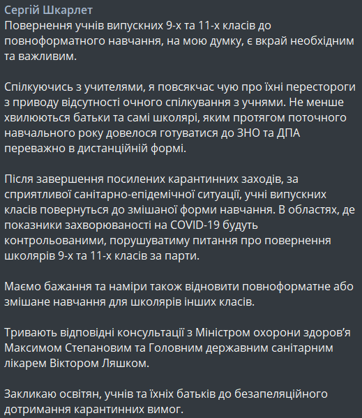 "После завершения усиленных карантинных мероприятий (то есть локдауна - Ред.), при благоприятной санитарно-эпидемической ситуации, учащиеся выпускных классов вернутся к смешанной форме обучения. В областях, где показатели заболеваемости СOVID-19 будут контролируемыми, будем поднимать вопрос о возвращении школьников 9-х и 11-х классов за парты", - написал Шкарлет в Телеграме.