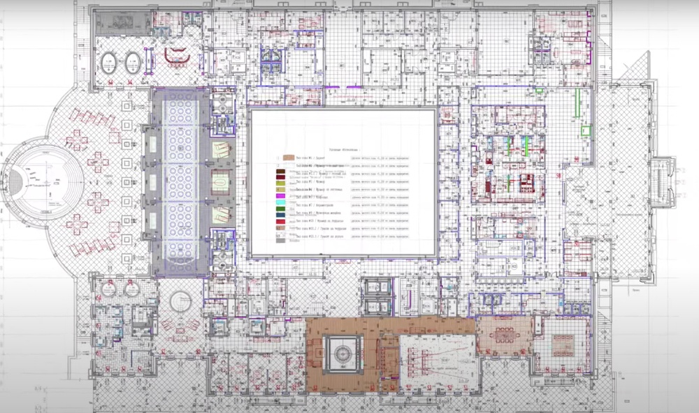 Один из подрядчиков, работавший на обустройстве дворца, прислал ФБК детальный архитектурный план объекта. На нем видно, что во дворце есть цокольный и еще два этажа. На цокольном расположились спа-зона, массажная, косметологический кабинет, спа-капсула, парикмахерская, огромный бассейн, сауны, хамамы, купели и чаши для купания.